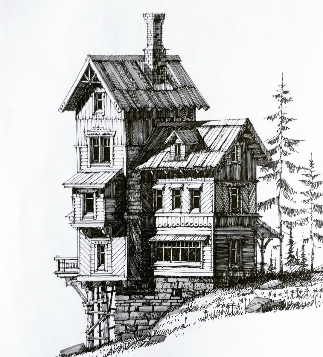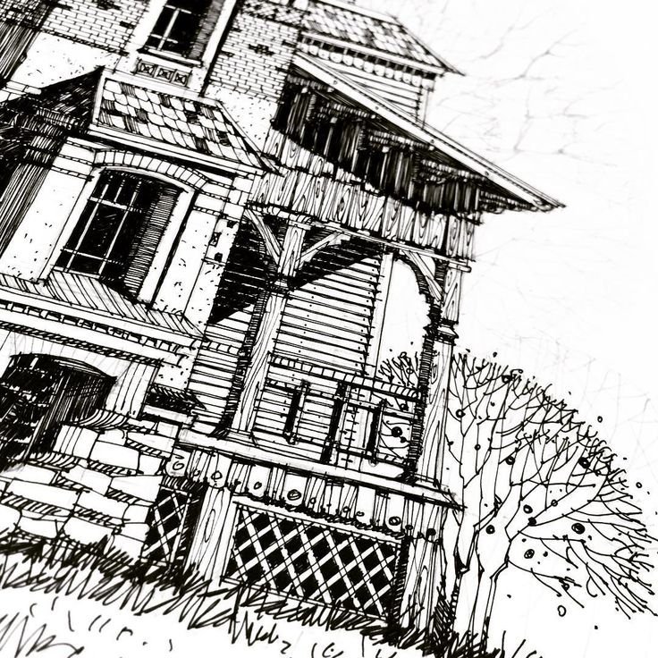 ![Скетчи домов ручкой]()