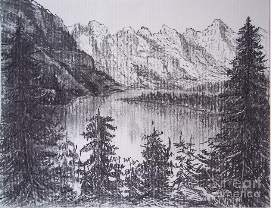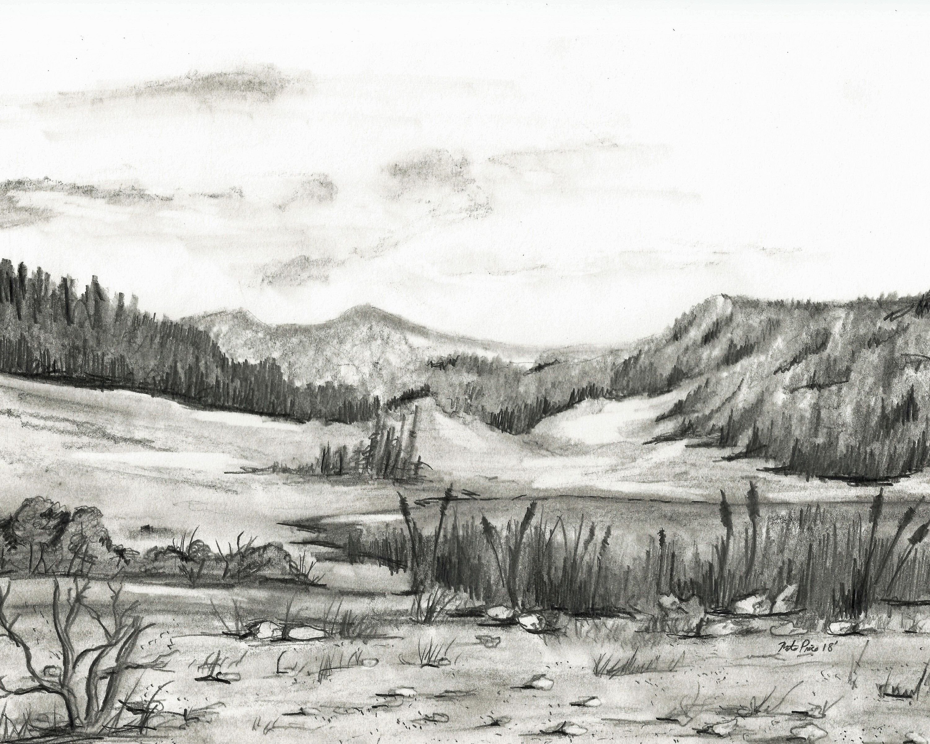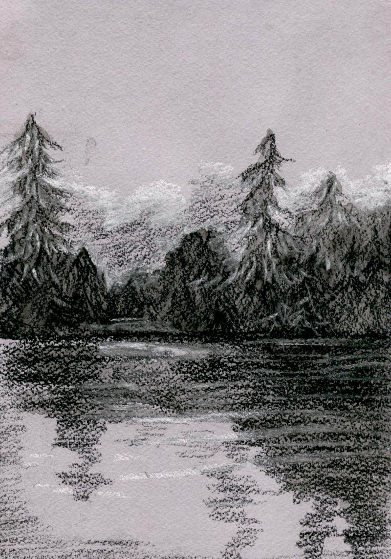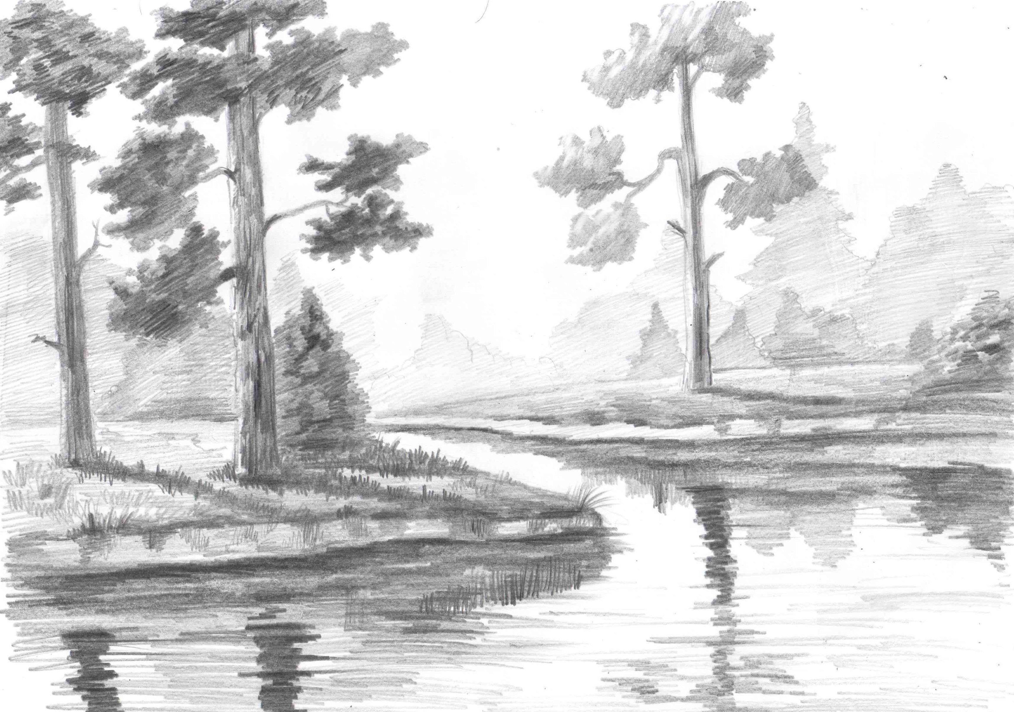 ![Пейзаж карандашом озеро]()