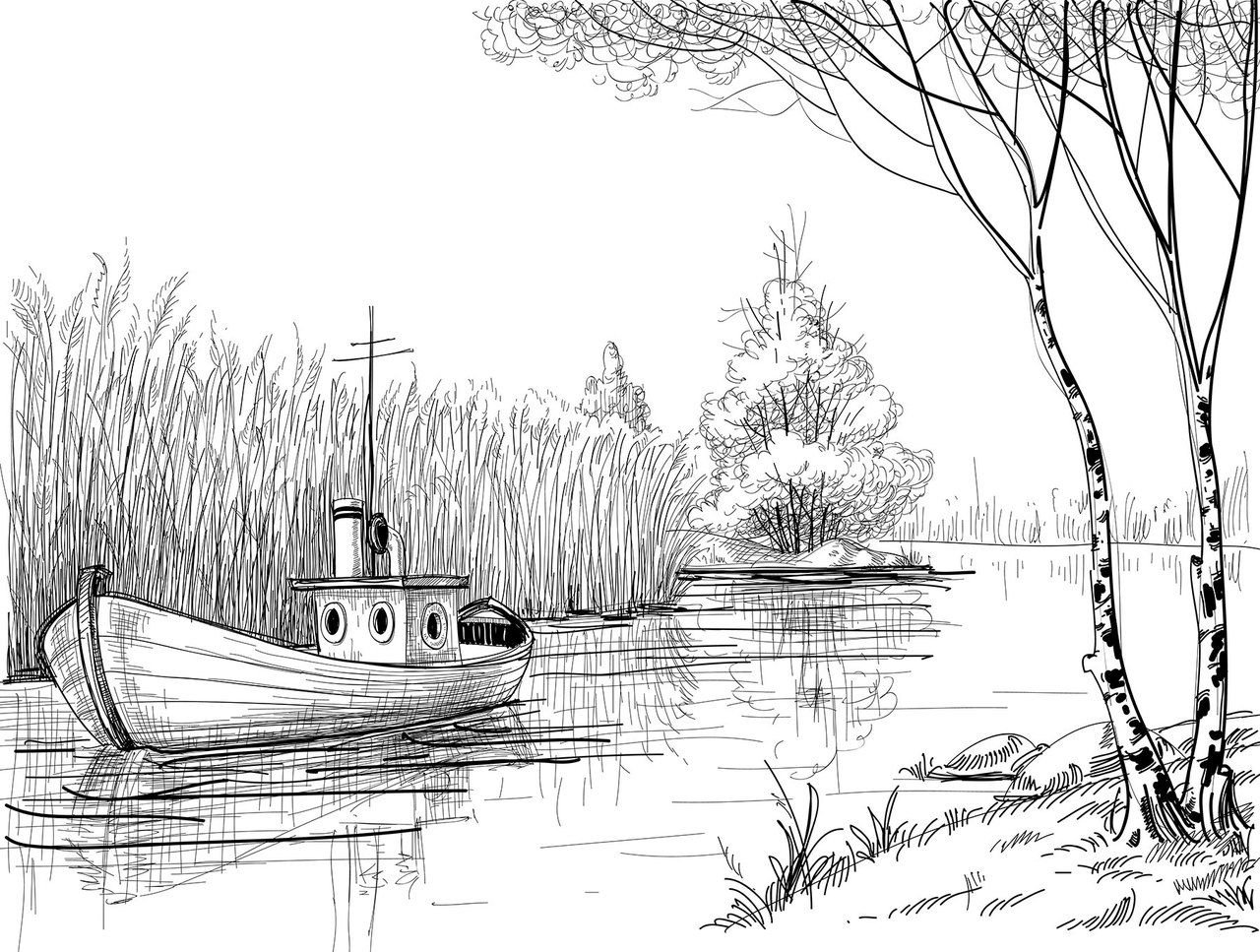 Лодка в озере карандашом