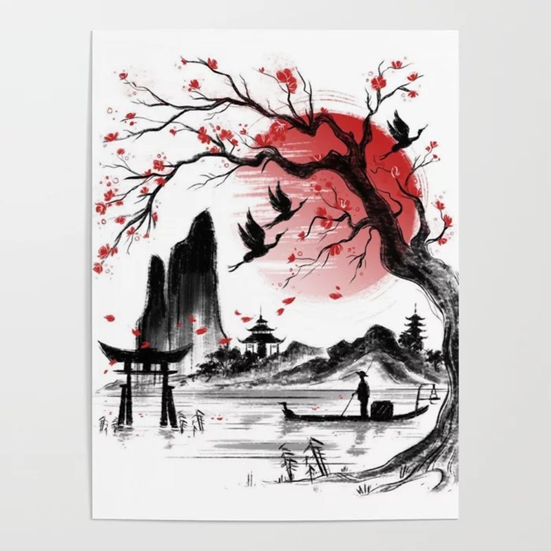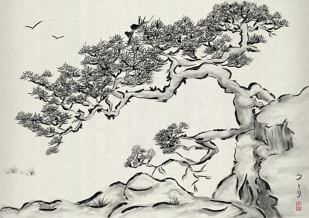 ![Японская живопись черно белая]()