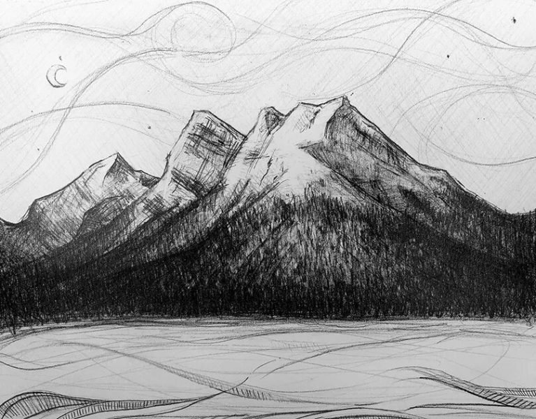 Рисунок гор, выполненный с использованием черной ручки, восхищает своей элегантностью и точностью деталей. Каждая линия искривляется и переплетается, создавая невероятно реалистичное изображение пиков, склонов и ущелий. Текущий теневой эффект добавляет глубину и объем к композиции, придавая ей мистическую атмосферу. Этот рисунок представляет собой настоящее произведение искусства, которое заставляет зрителя восхищаться красотой и величием горного ландшафта.