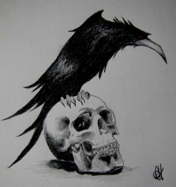 ![Черный ворон на черепе]()