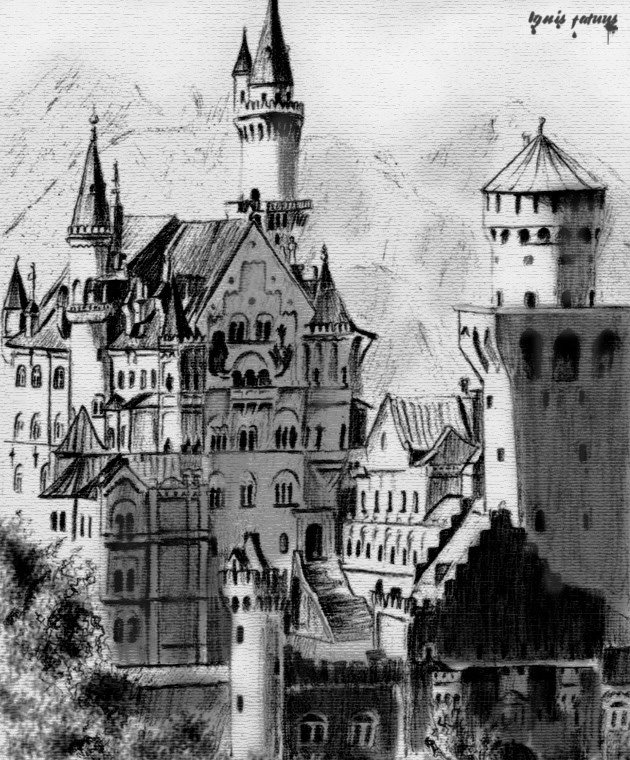 ![Эскиз замка Нойшванштайн]()