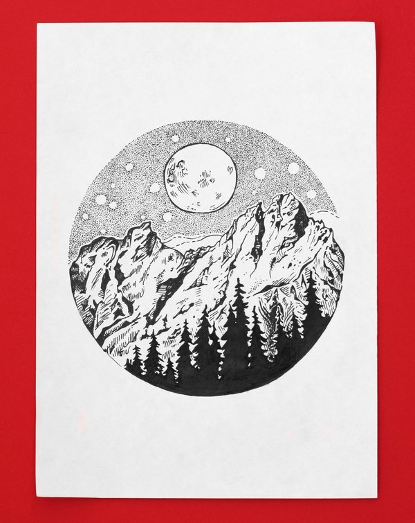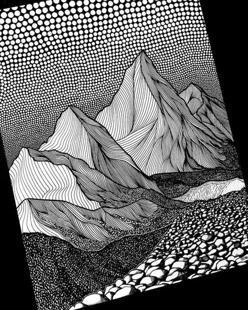 Горный пейзаж черной ручкой