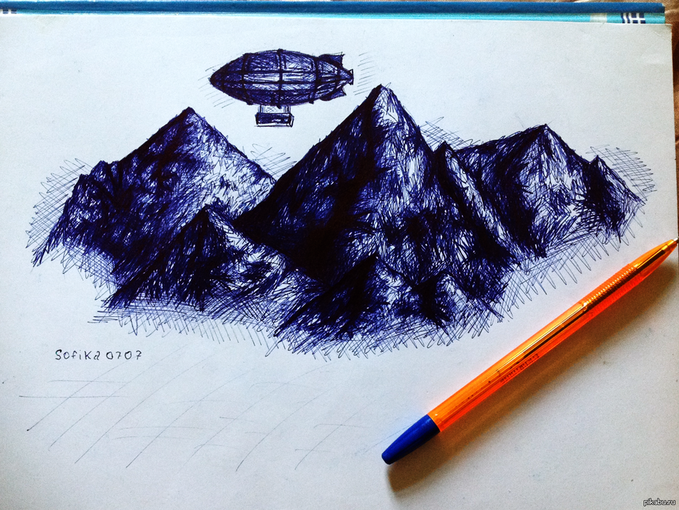 ![Горный пейзаж гелевой ручкой]()