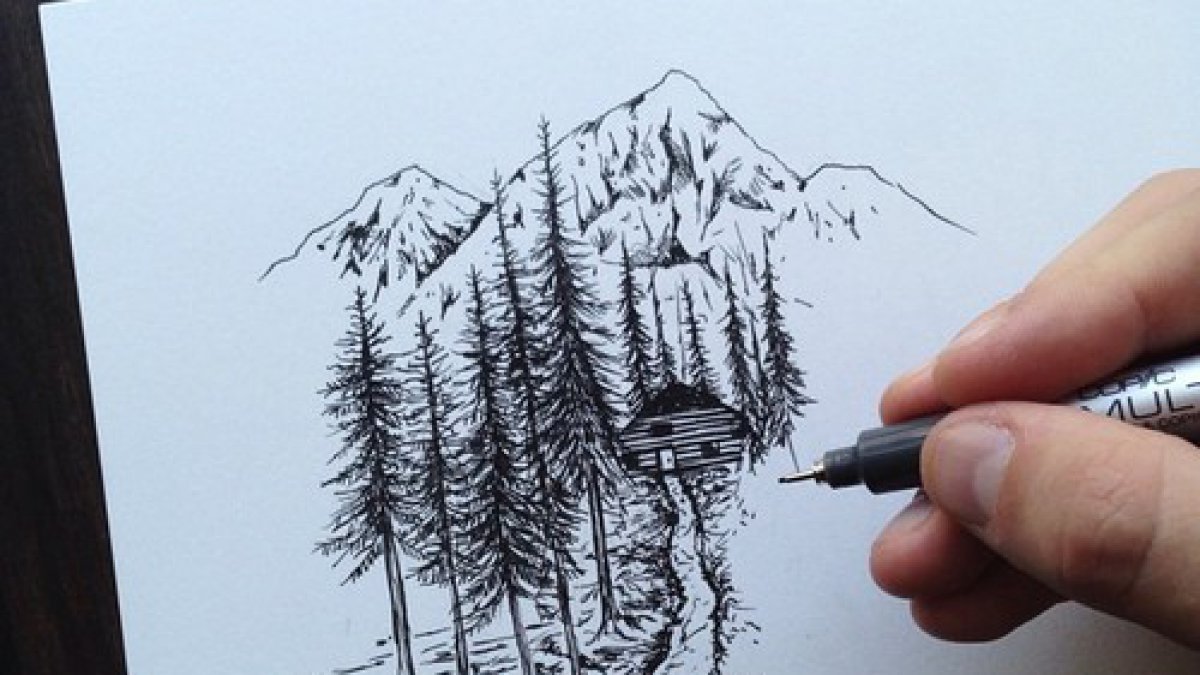 ![Горный пейзаж черной ручкой]()