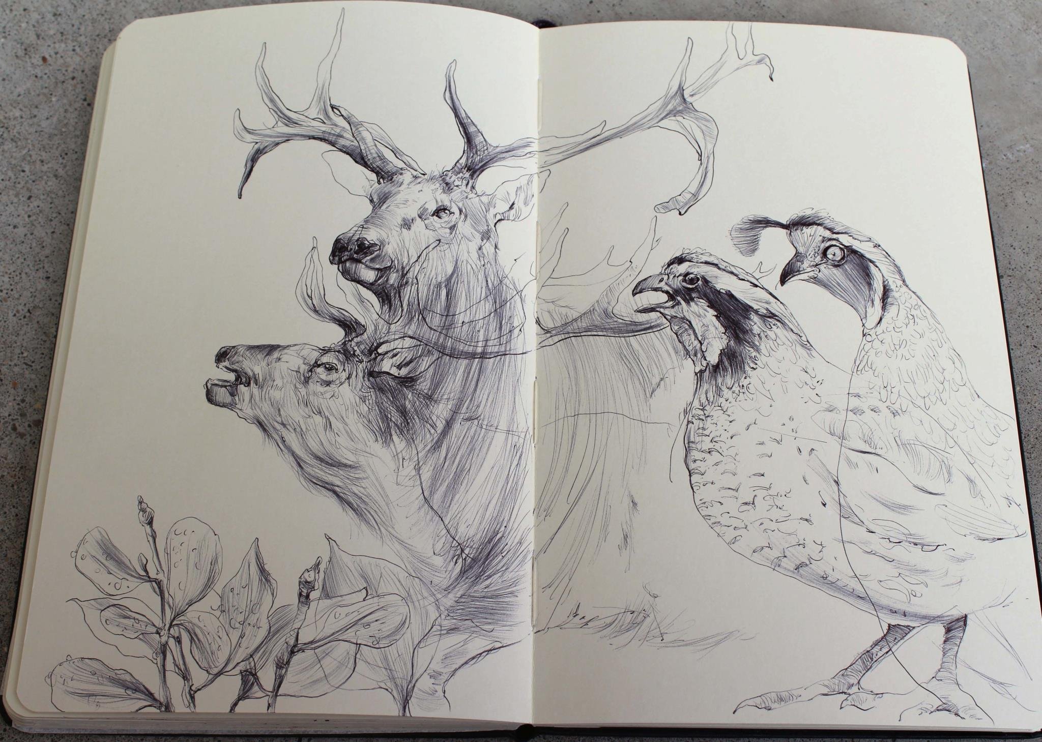 ![Рисунки тушью в скетчбуке]()