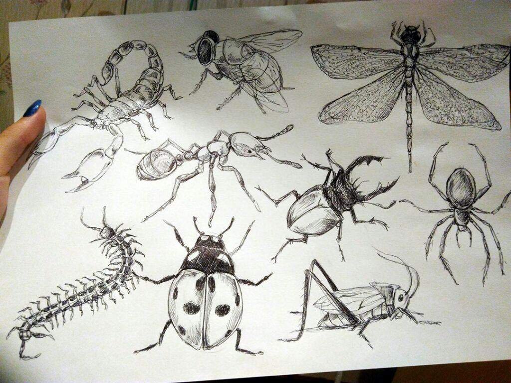 ![Зарисовки насекомых гелевой ручкой]()