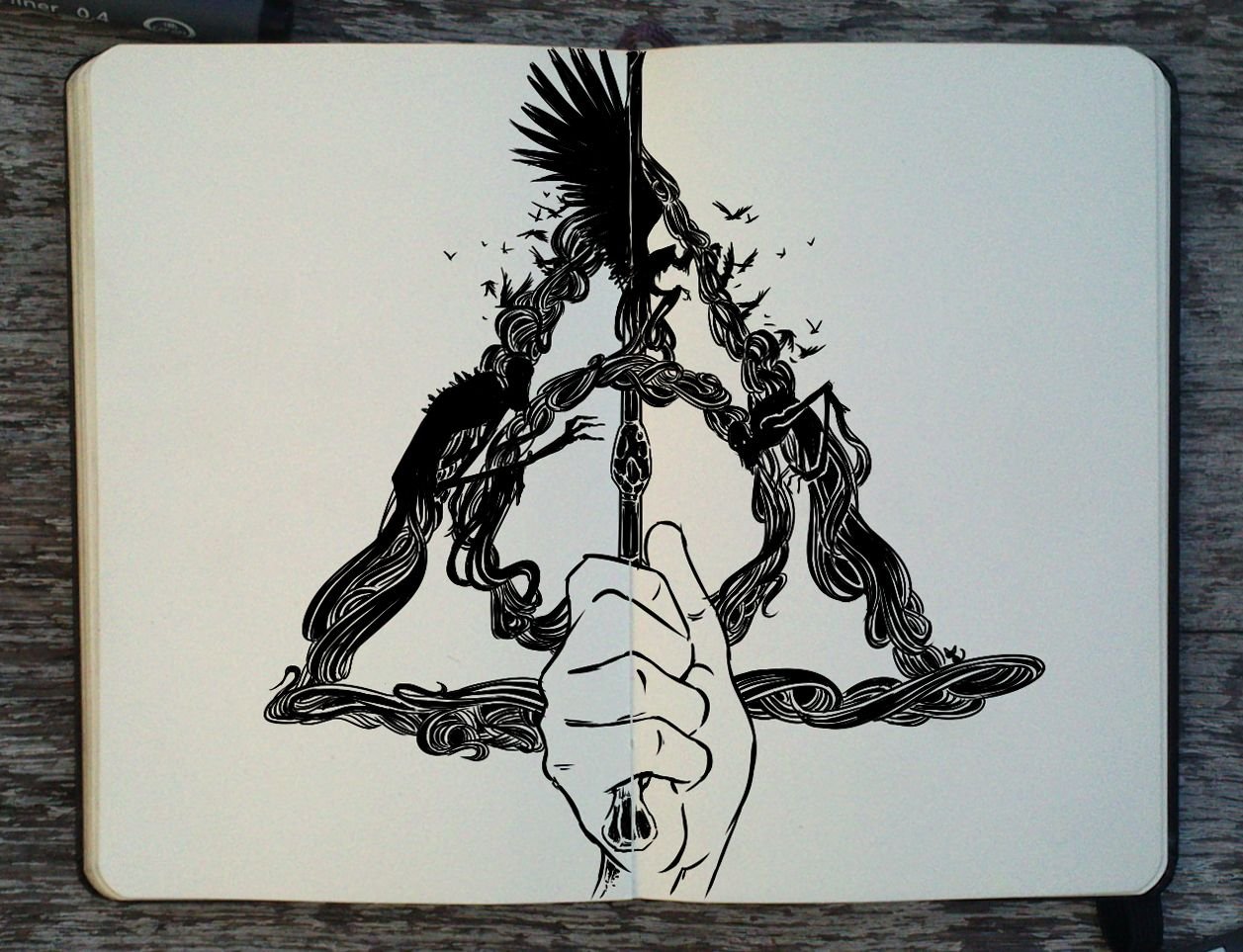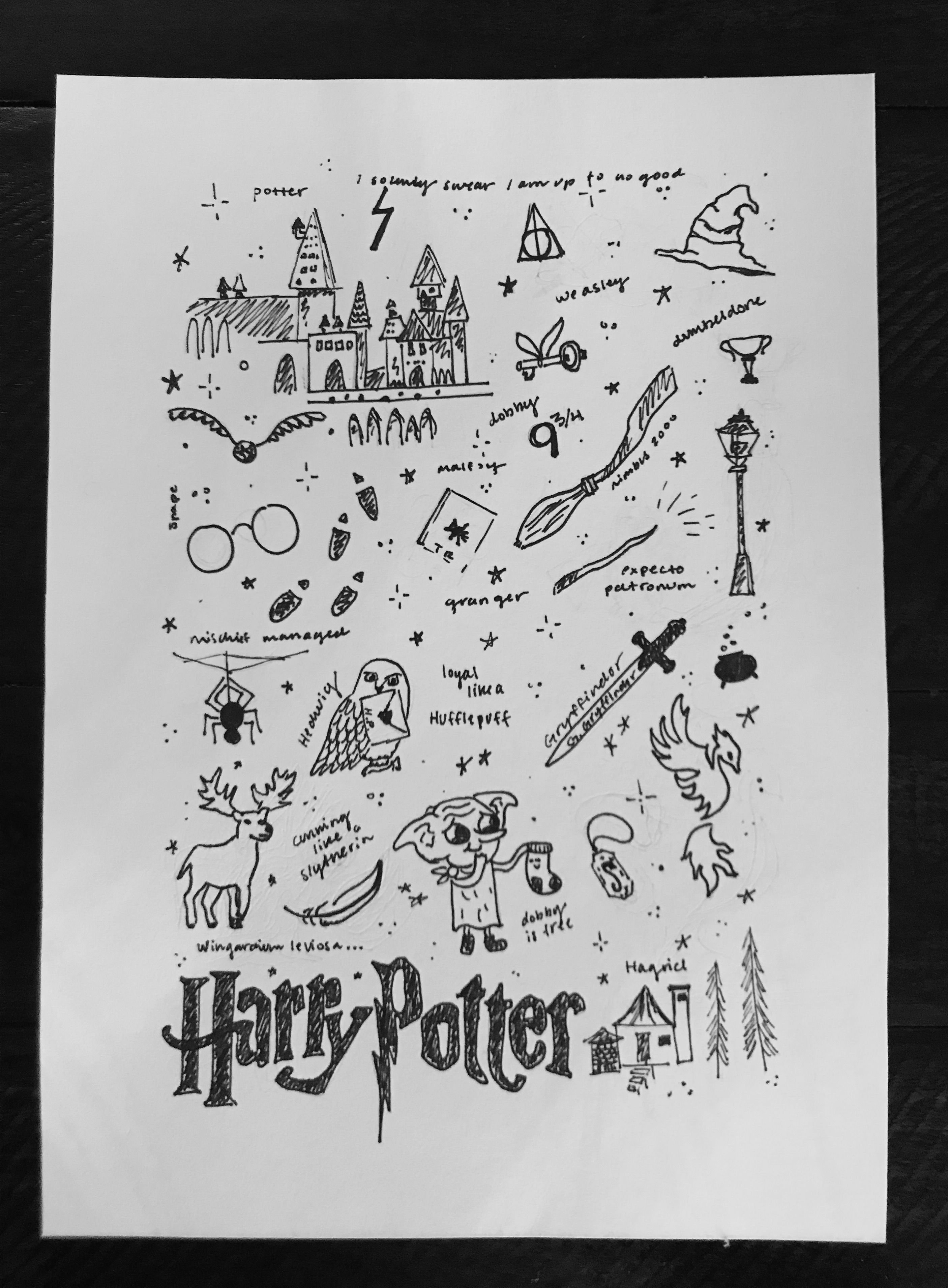 ![Скетчи черной ручкой с Гарри Поттером]()