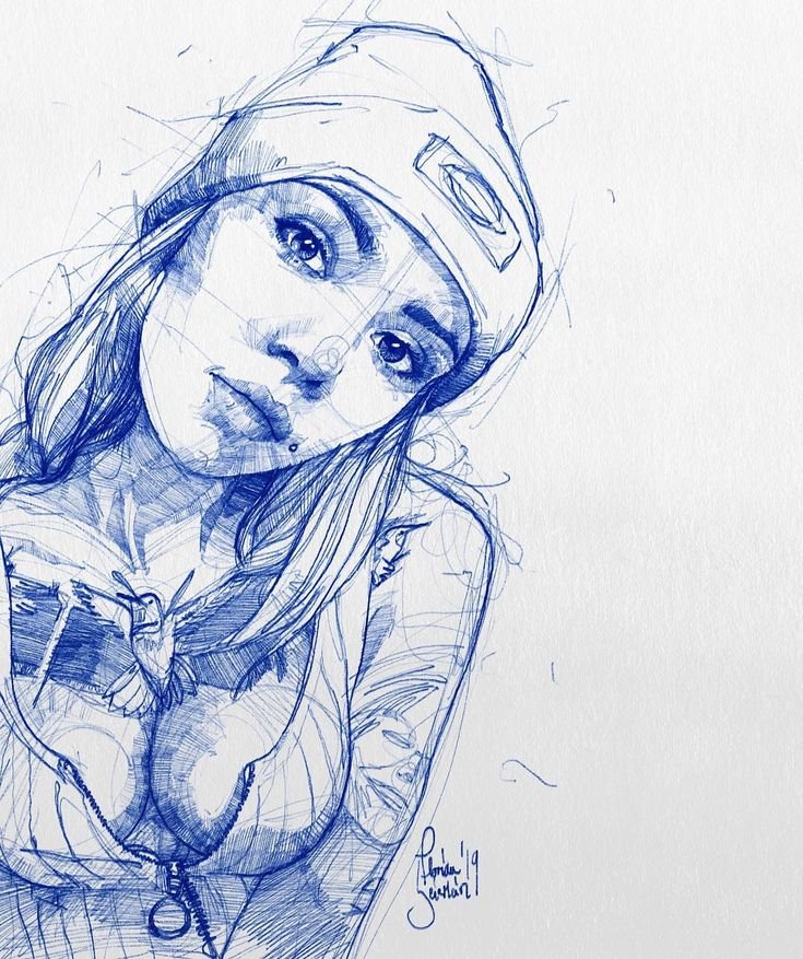 ![Рисунок девушки шариковой ручкой]()