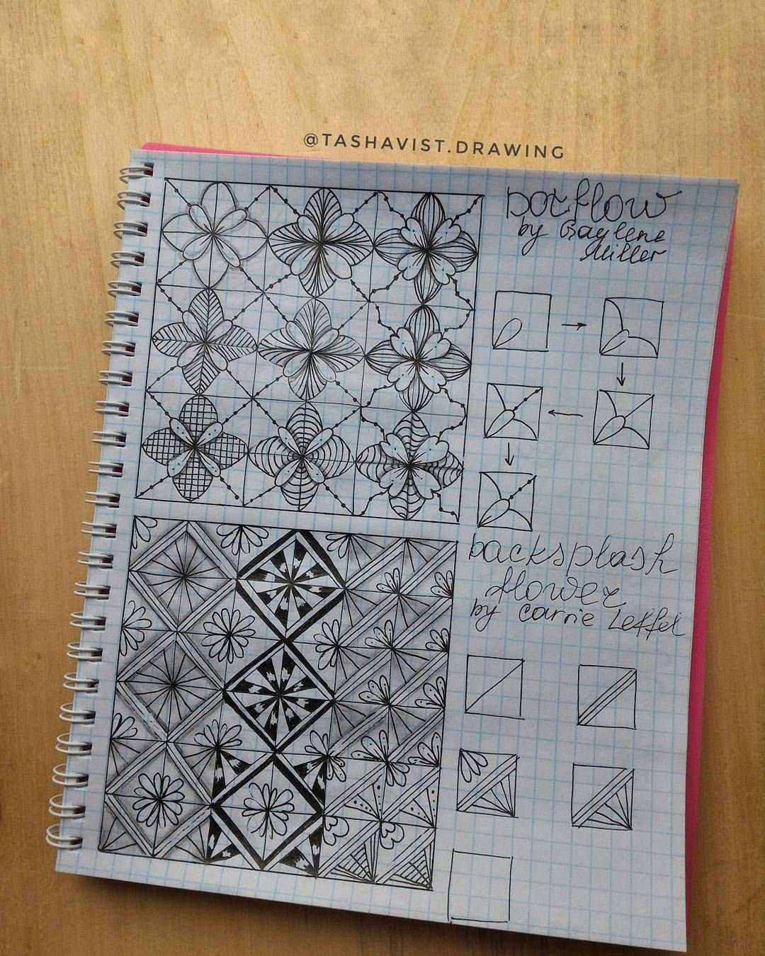![Рисунки по клеточкам чёрной ручкой в тетради]()