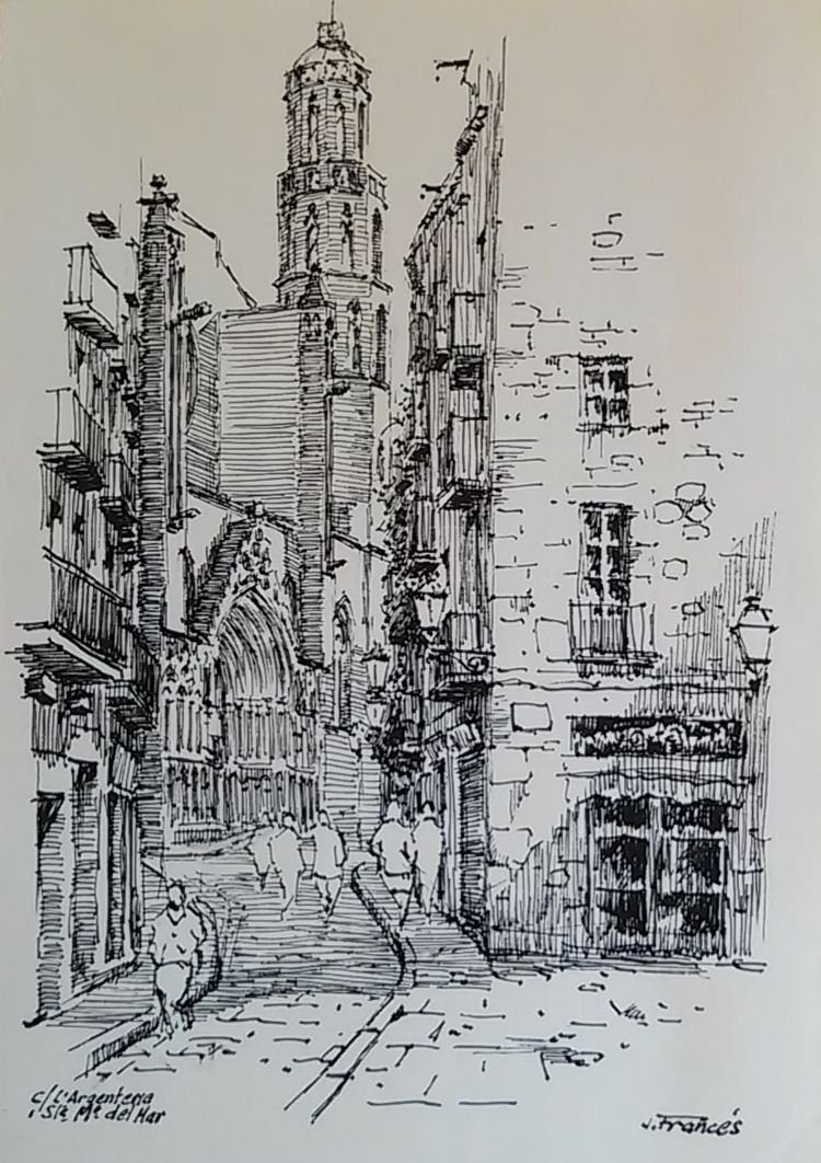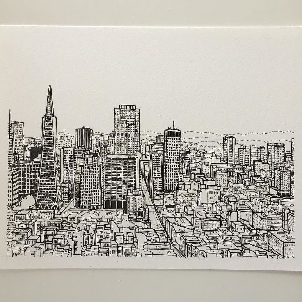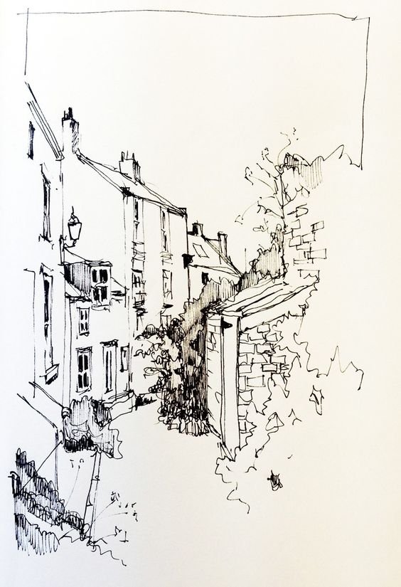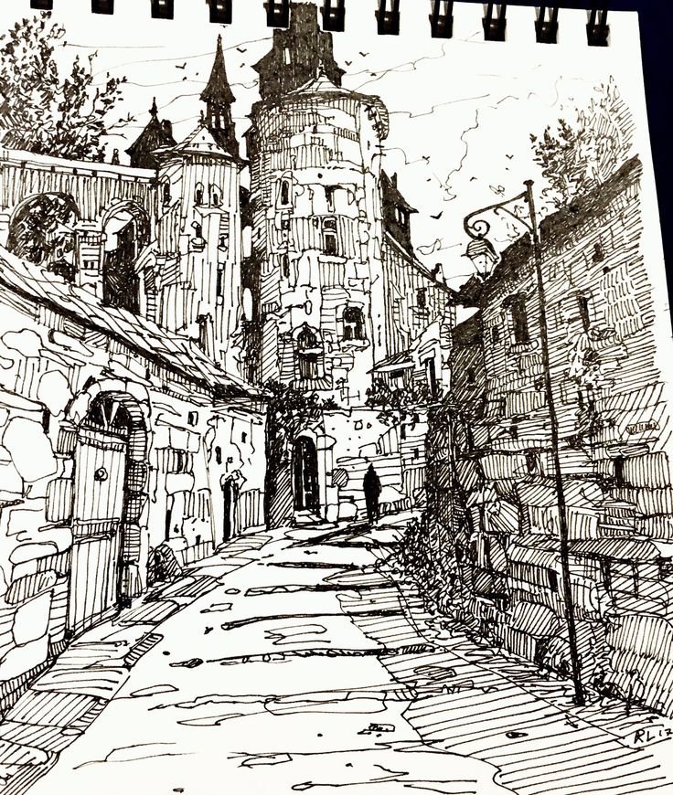![Городской пейзаж черной ручкой]()