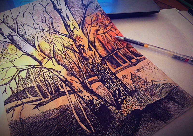 ![Пейзаж акварелью и гелевой ручкой]()
