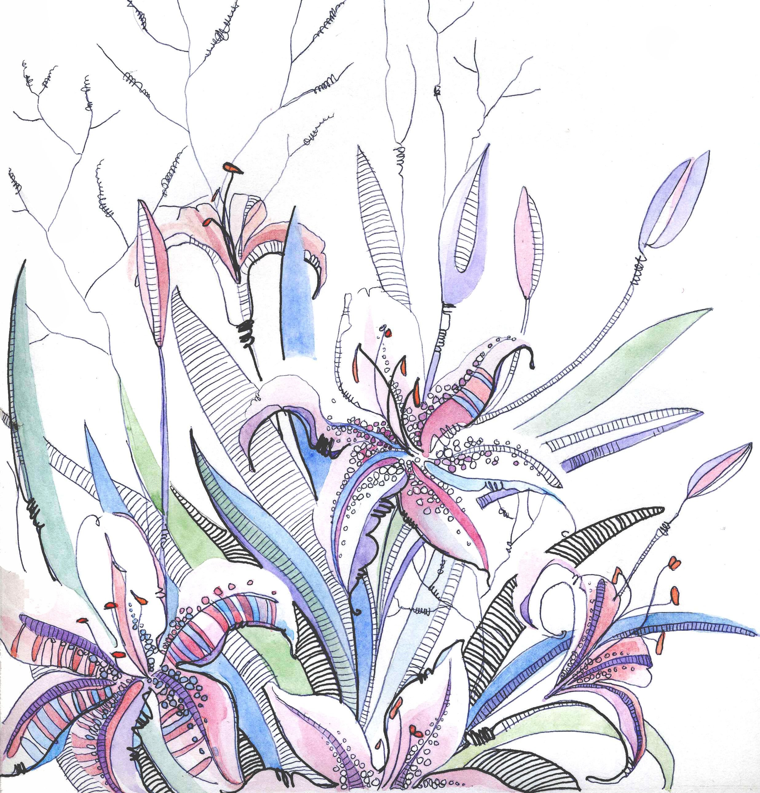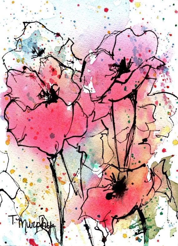 ![Цветы акварелью и черной ручкой]()