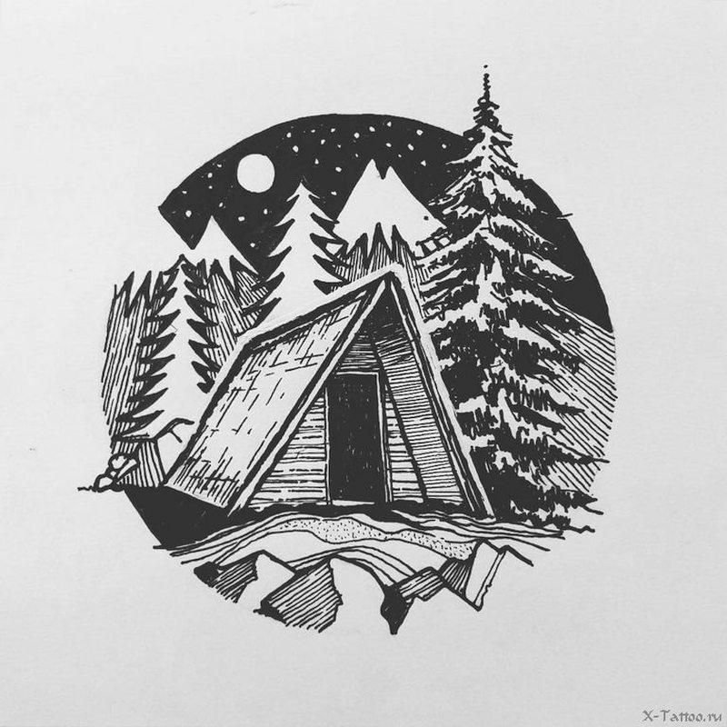 Эскиз тату дом в лесу