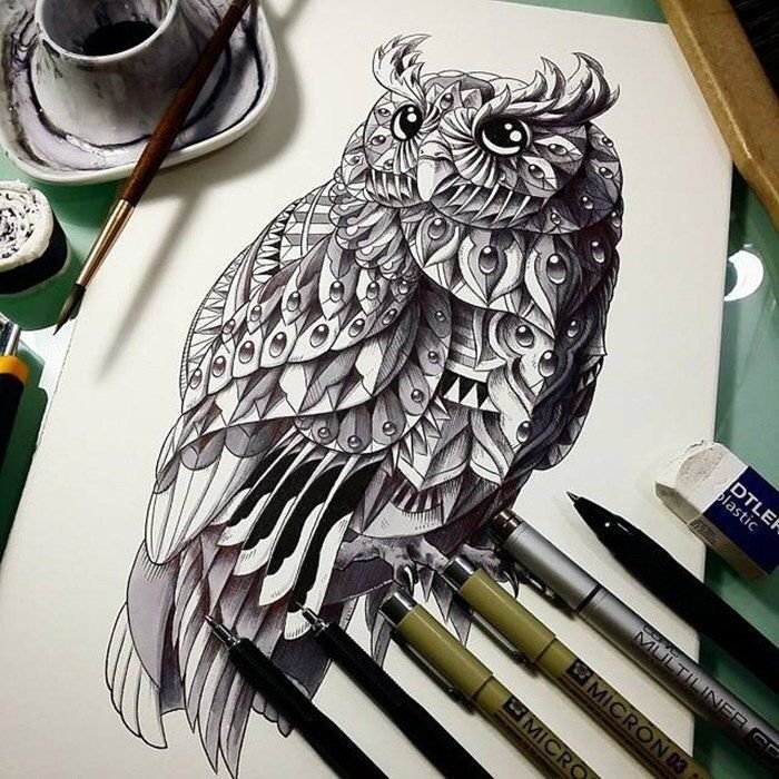 ![Сова рисунок ручкой]()