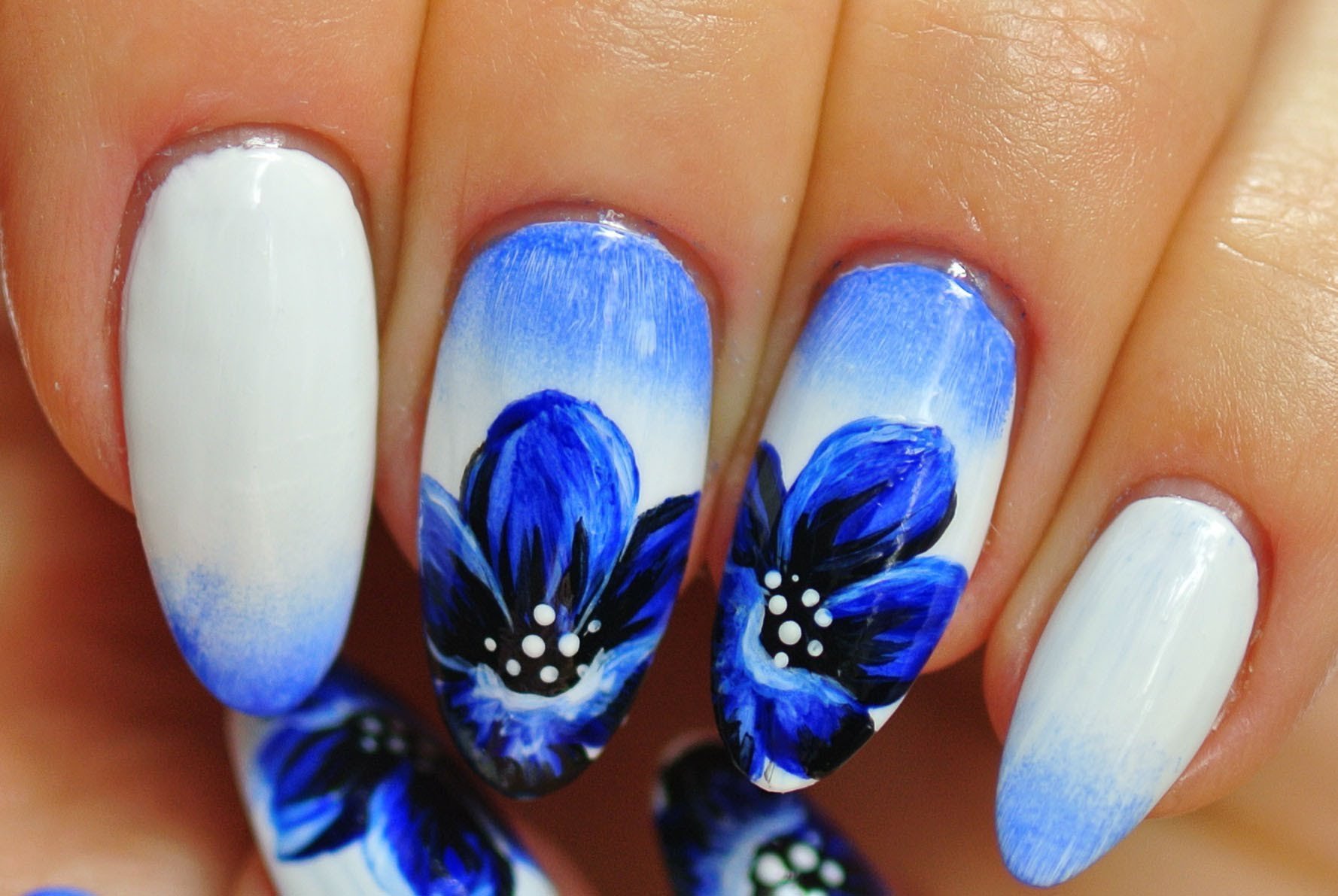 ![Синие цветы на ногтях]()