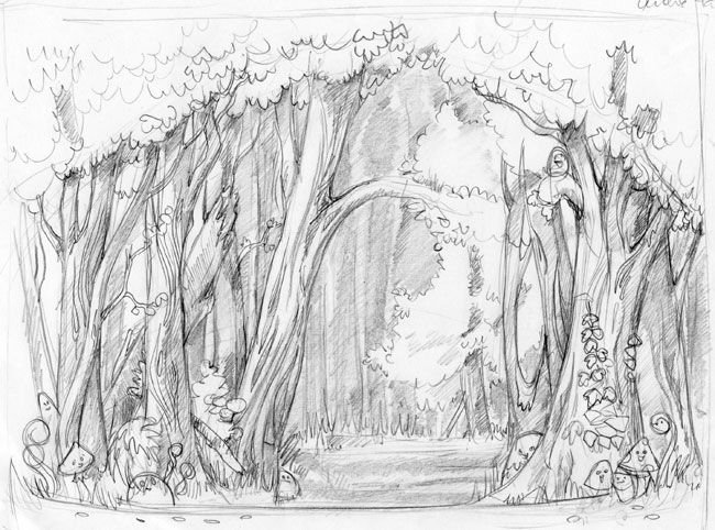 ![Набросок рисунка леса сзади]()