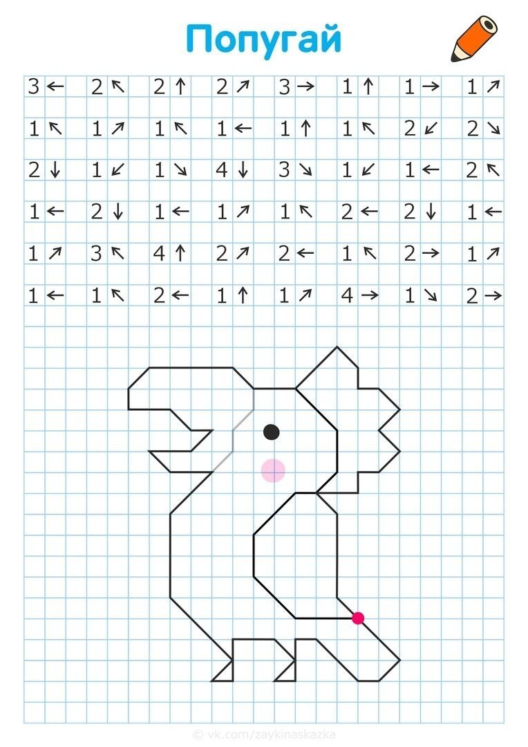![Графический диктант попугай по клеточкам для дошкольников]()