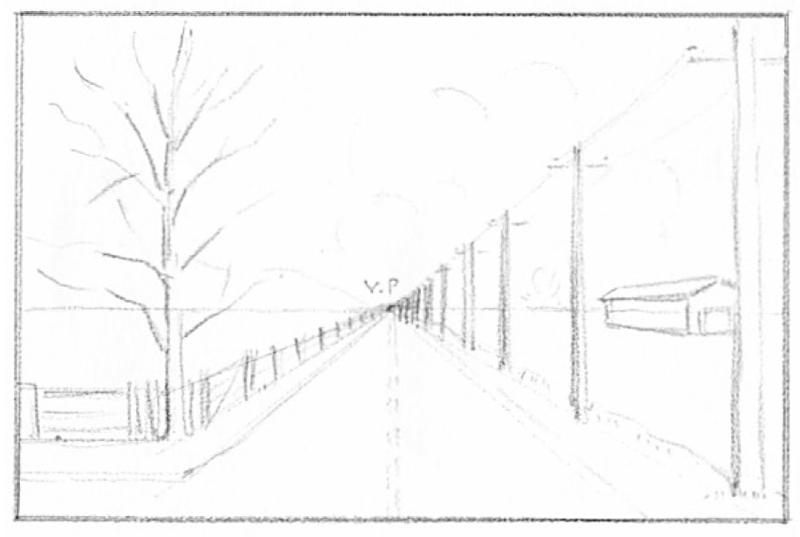 ![Линейная перспектива (дорога, столбы, дома), карандаш]()