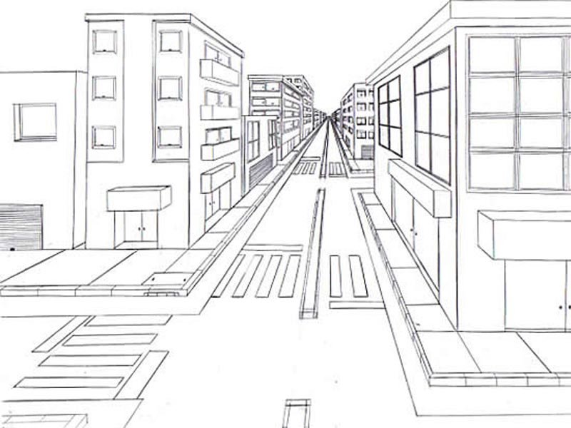![Город линейная перспектива с одной точкой схода]()