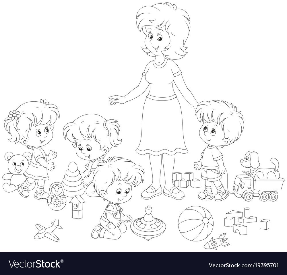 ![Дети и воспитатель разукрашка для детей]()
